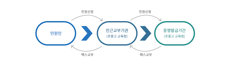- 신분증을 지참하고 전국의 시·도교육청 민원실및 국·공·사립 초·중·고등학교 행정실을 방문하여 해당 신청서를 작성하여 팩스(fax)로 민원을 신청하고 3시간 아내로 교부받으실 수 있습니다.